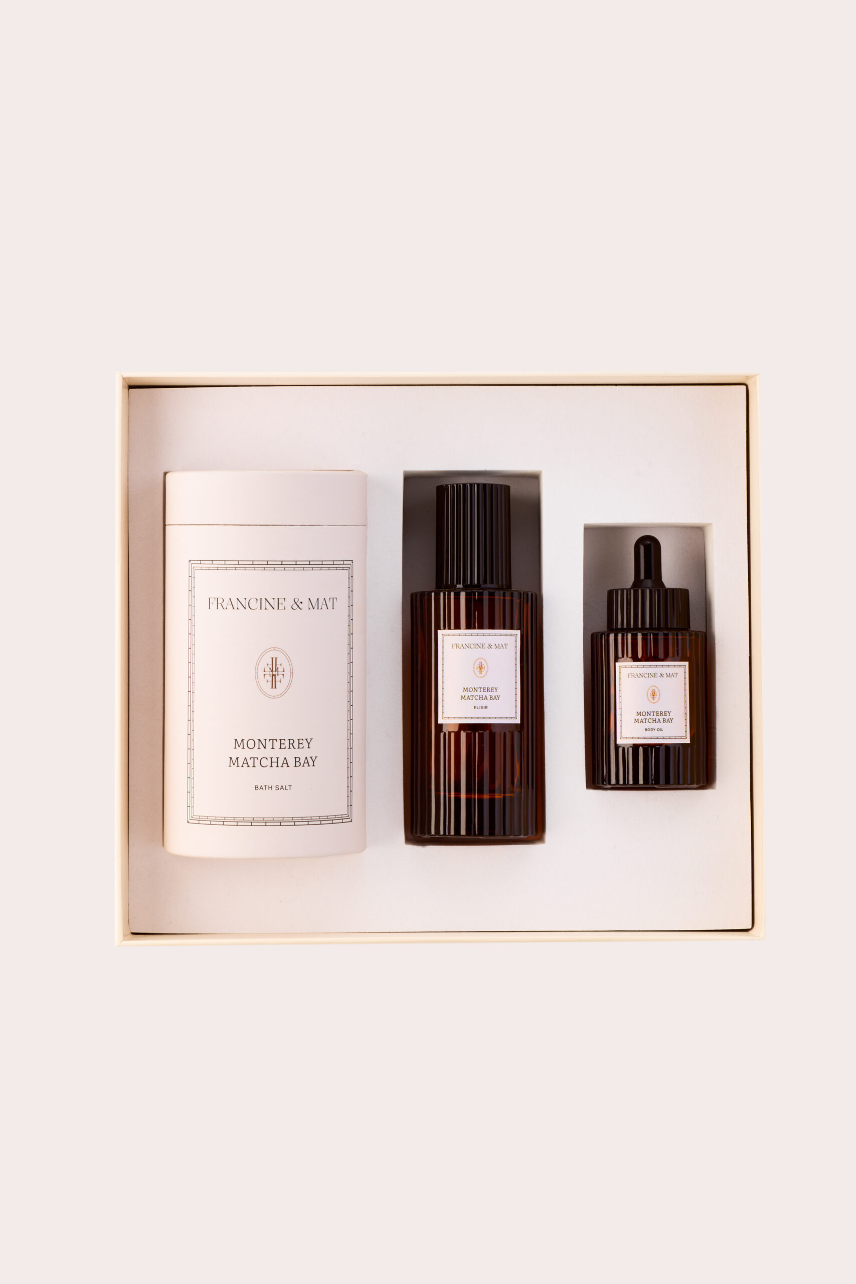 The Monterey Matcha Bay set is a luxurious energizing and soothing ritual, presented in an elegant, rigid gift box with a soft-touch finish and embossed logo. This botanical treatment combines the potency of a Serum-Mist with CICA and Niacinamide (100 ml), a firming Avocado & Mint Body Oil (40 ml), and a detoxifying Bath Salt with Japanese Matcha and Spirulina (540 g).